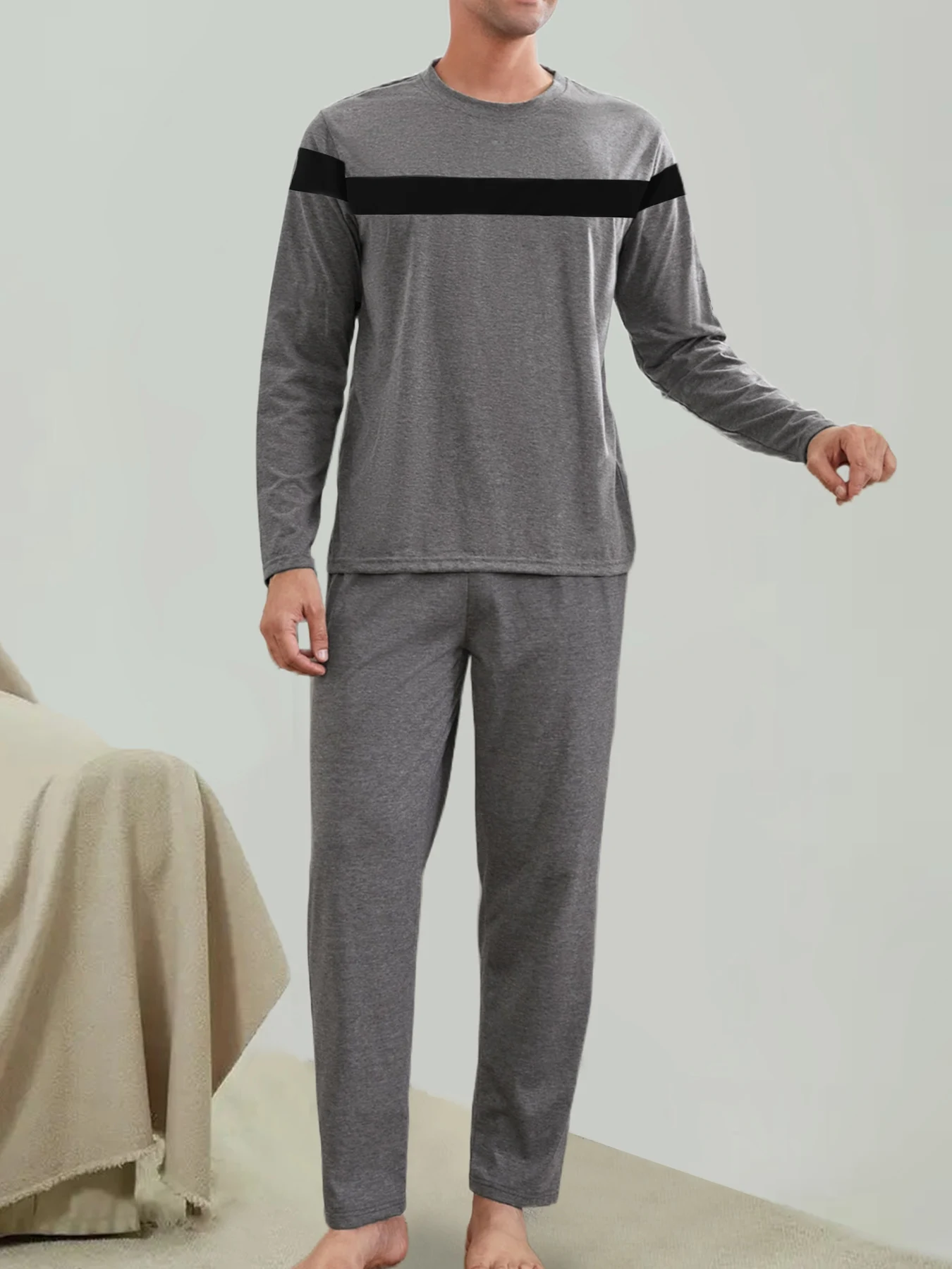 Pánské šedá & černá barva blok loungewear sada 2se kusu mužstvo krk dlouhé rukáv & kalhot ležérní pyžamo