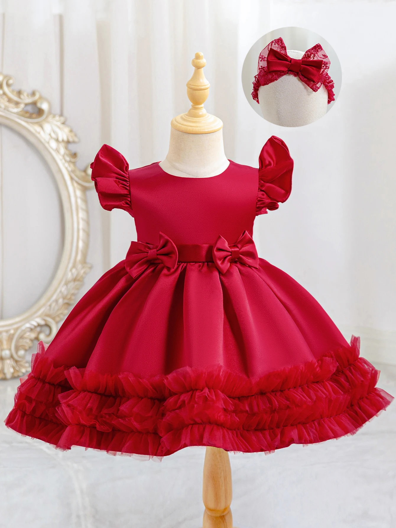 Děťátko děvče červená křest šaty pro 100 dnů narozeniny, načechraný závoj šaty večírek svatební kvést děvče šaty s luk čelenka
