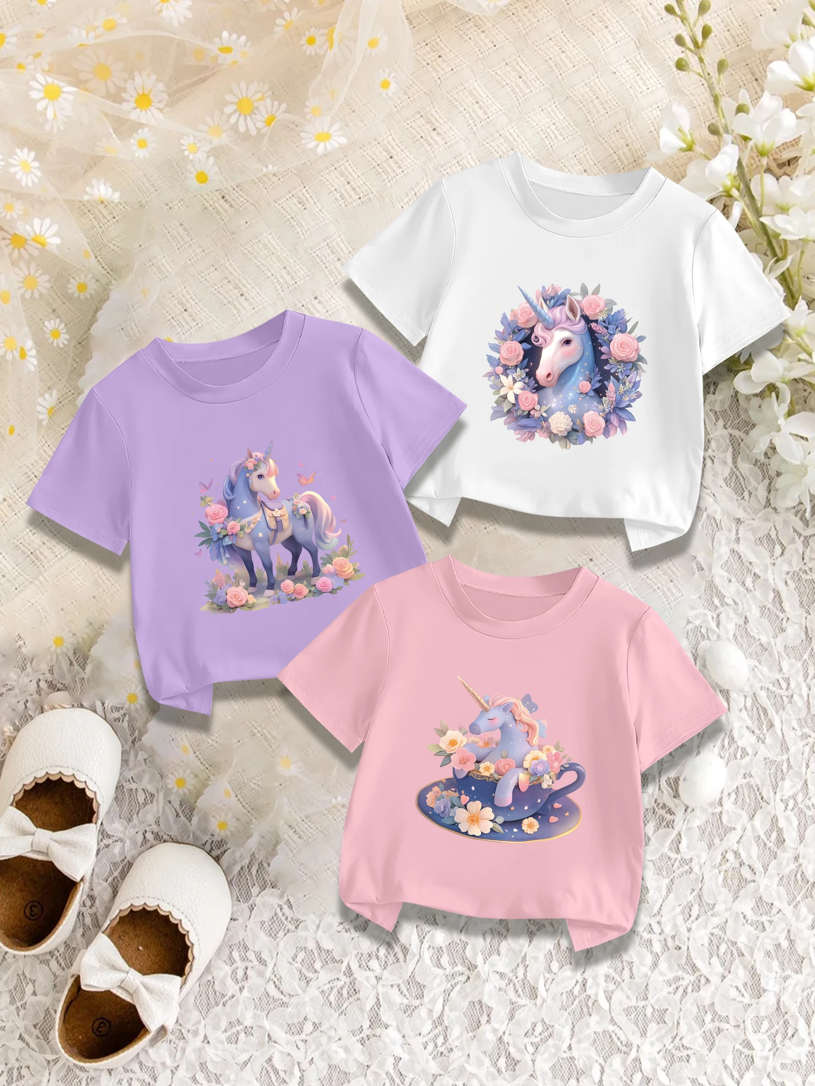 3čepel pieces: dívčí roztomilá léto krátký rukáv tričko kreslený jednorožce růže střih sladké denně nejvyšší
