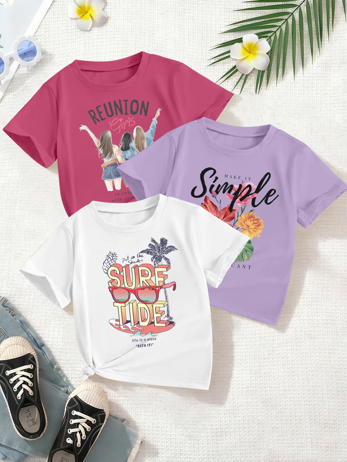 3čepel kousky, americký sladké a hustý styl pro dívčí, brýle, květinová střih tisk, sladké a roztomilá ležérní trička pro dívčí