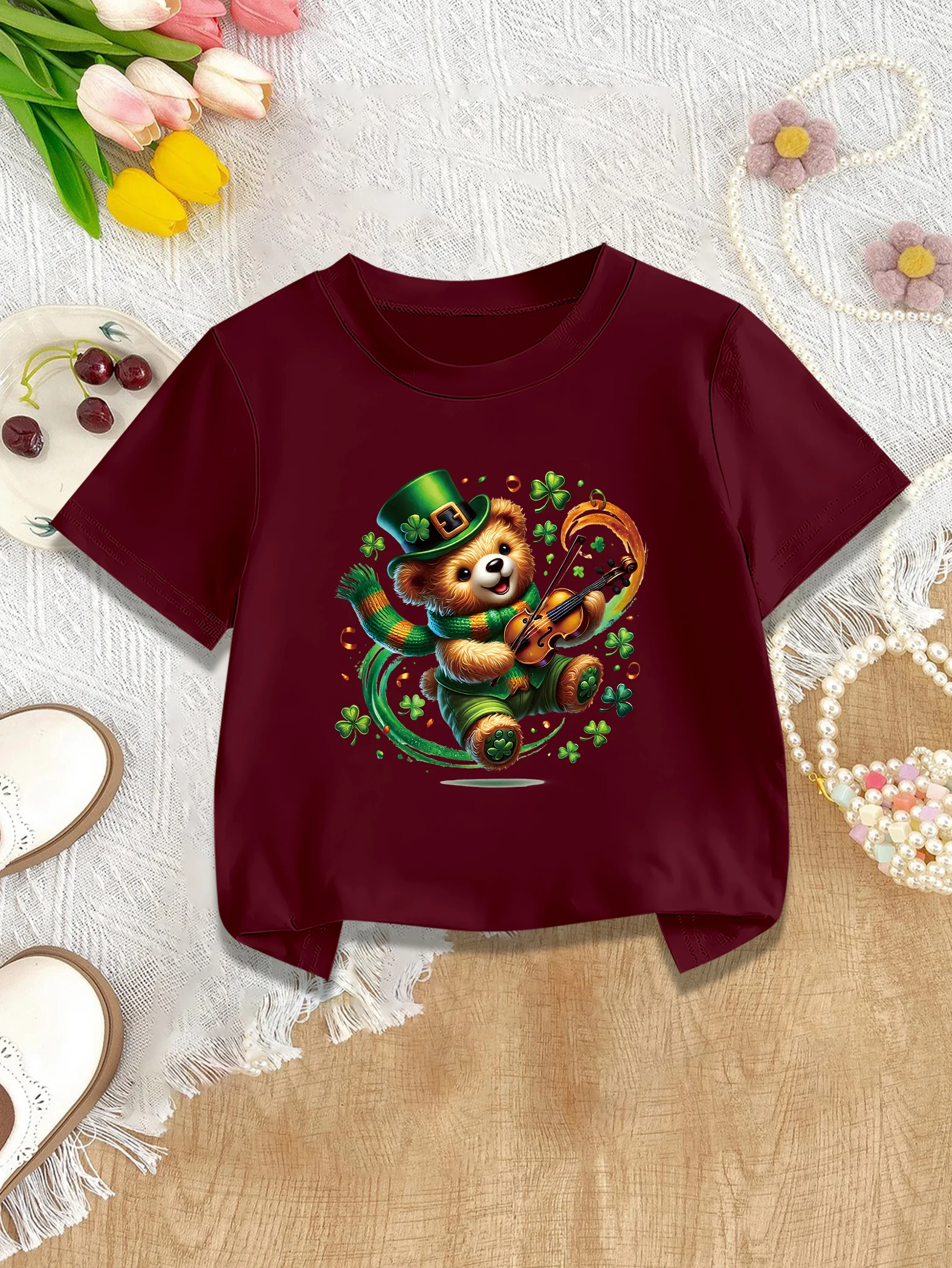 1 pieces: st.patrick's den kreslený medvěd hrací housle tisk dívčí sladké trička pro léto