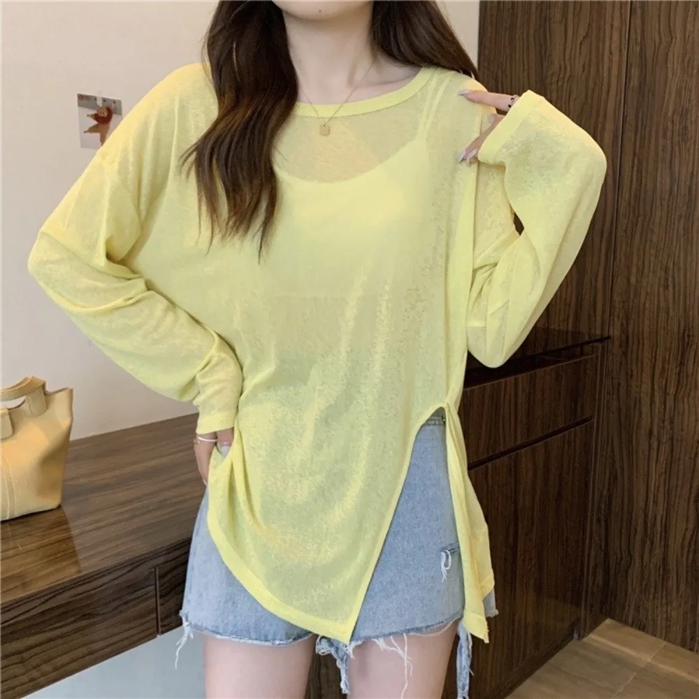 Volný čas hubený opalovací krém tričko čistý barva kolo krk dlouhé rukáv nejvyšší volné nadrozměrné vzduch conditioning zakrýt pouliční oblečení