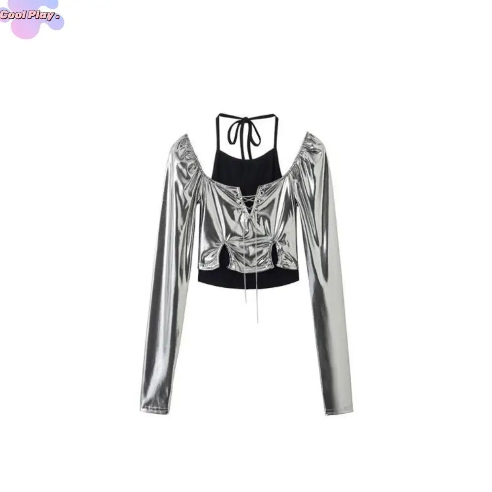 Sladké leskle dlouhé rukáv T košile pulovr patchwork falešná two-pieces košile iny osobnost Y2K štíhlý osvěta topy ženské