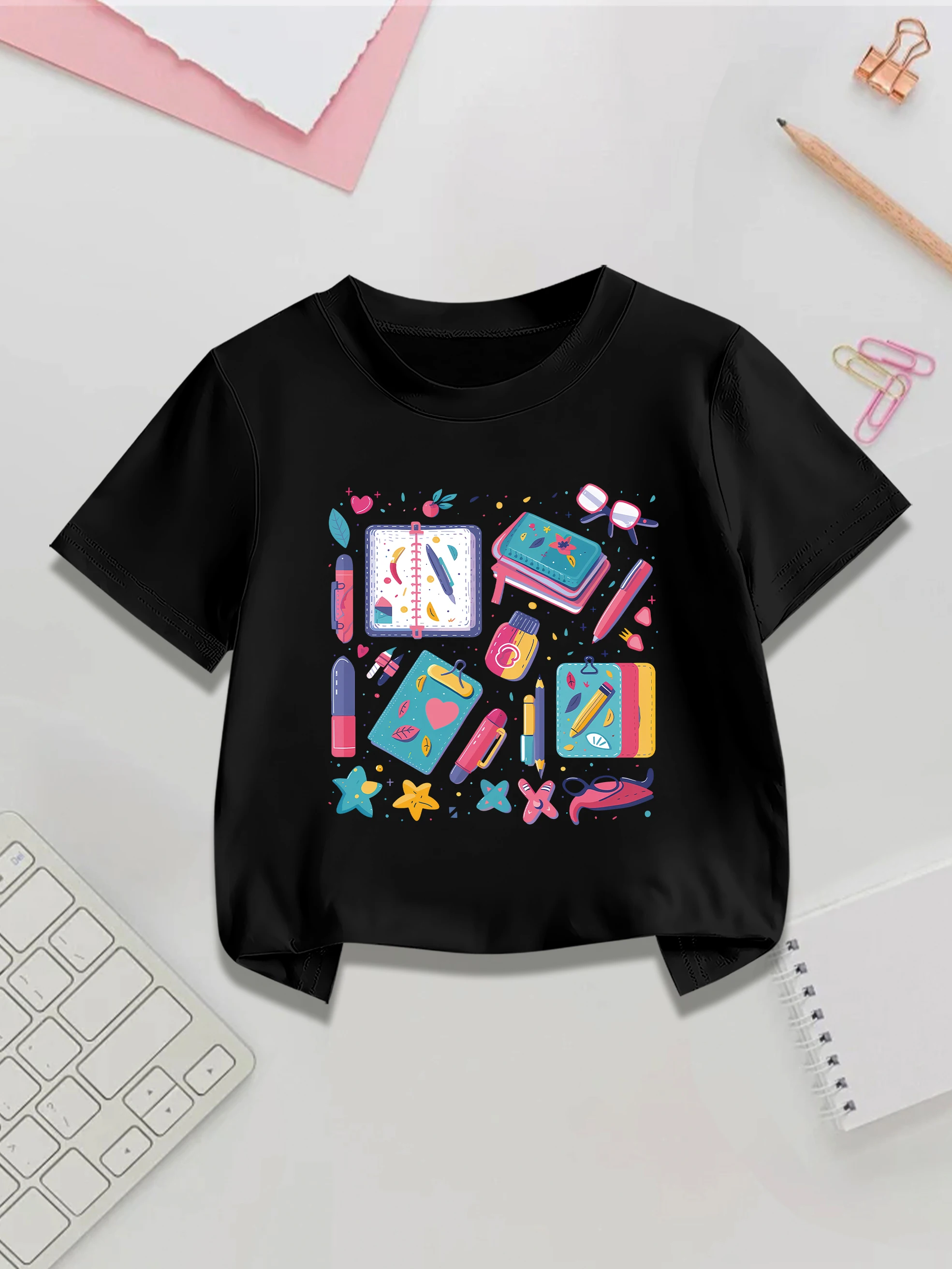 1 pieces: back-to-school období kreslený notebook & fontána pero tisk dívčí sladké roztomilá léto short-sleeve tričko