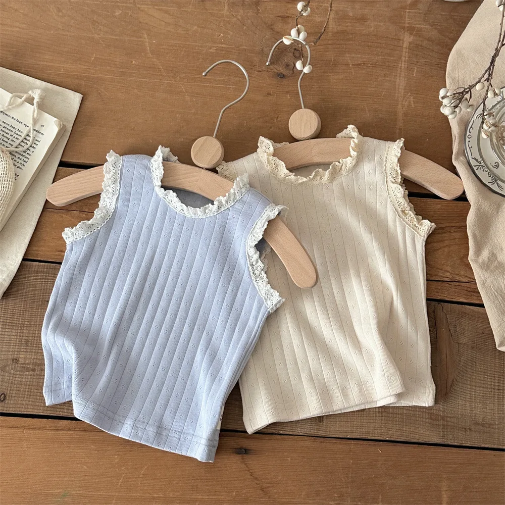 2026 léto nový děťátko děvče sladké krajka bez rukávů T košile kojenec roztomilá dutý vyndat žebrované topy dívčí bavlna tílko batole oblečení