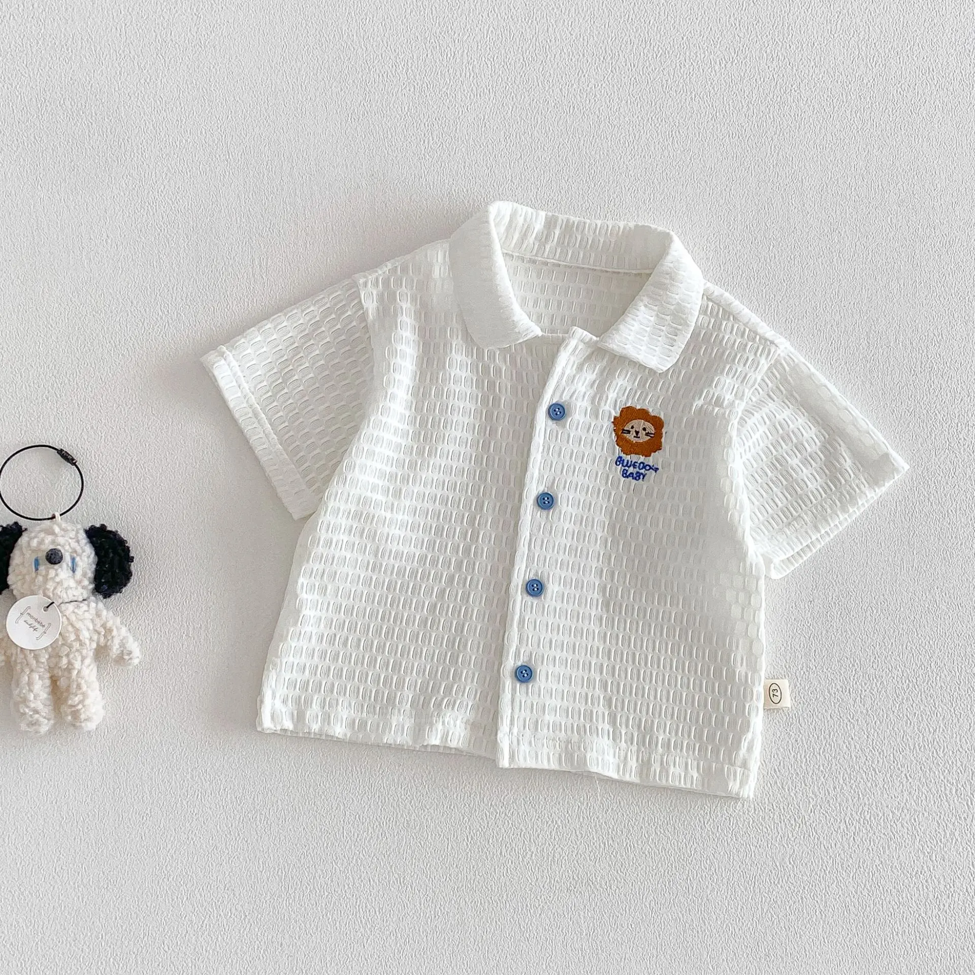 2026 léto 6M-4T childrens oblečení roztomilá lev vyšívané oplatek short-sleeve chlapci košile s kontrast modrá knoflíků