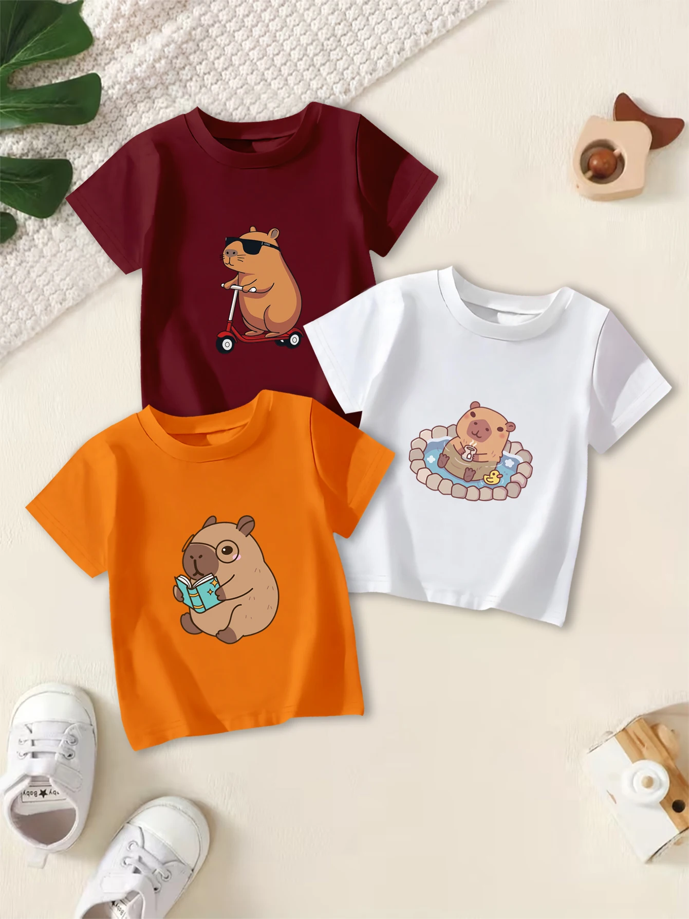 3čepel pieces: chlapci léto ležérní tričko kreslený kapybara reading&hot spring&skateboarding střih tisk