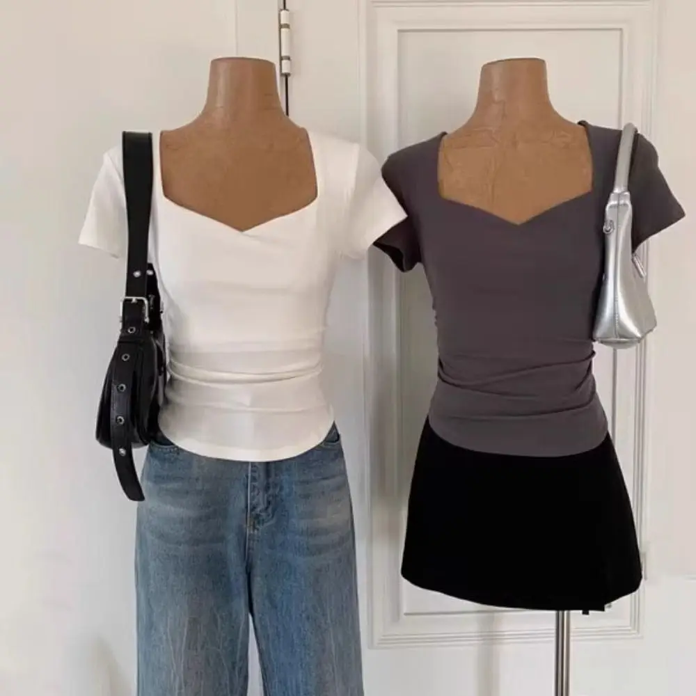 Jednoduchý štíhlý odpovídat Y2K osvěta topy plisované léto korejské tričko krátký rukávy ženy oblečení celistvý krátký tričko dámy