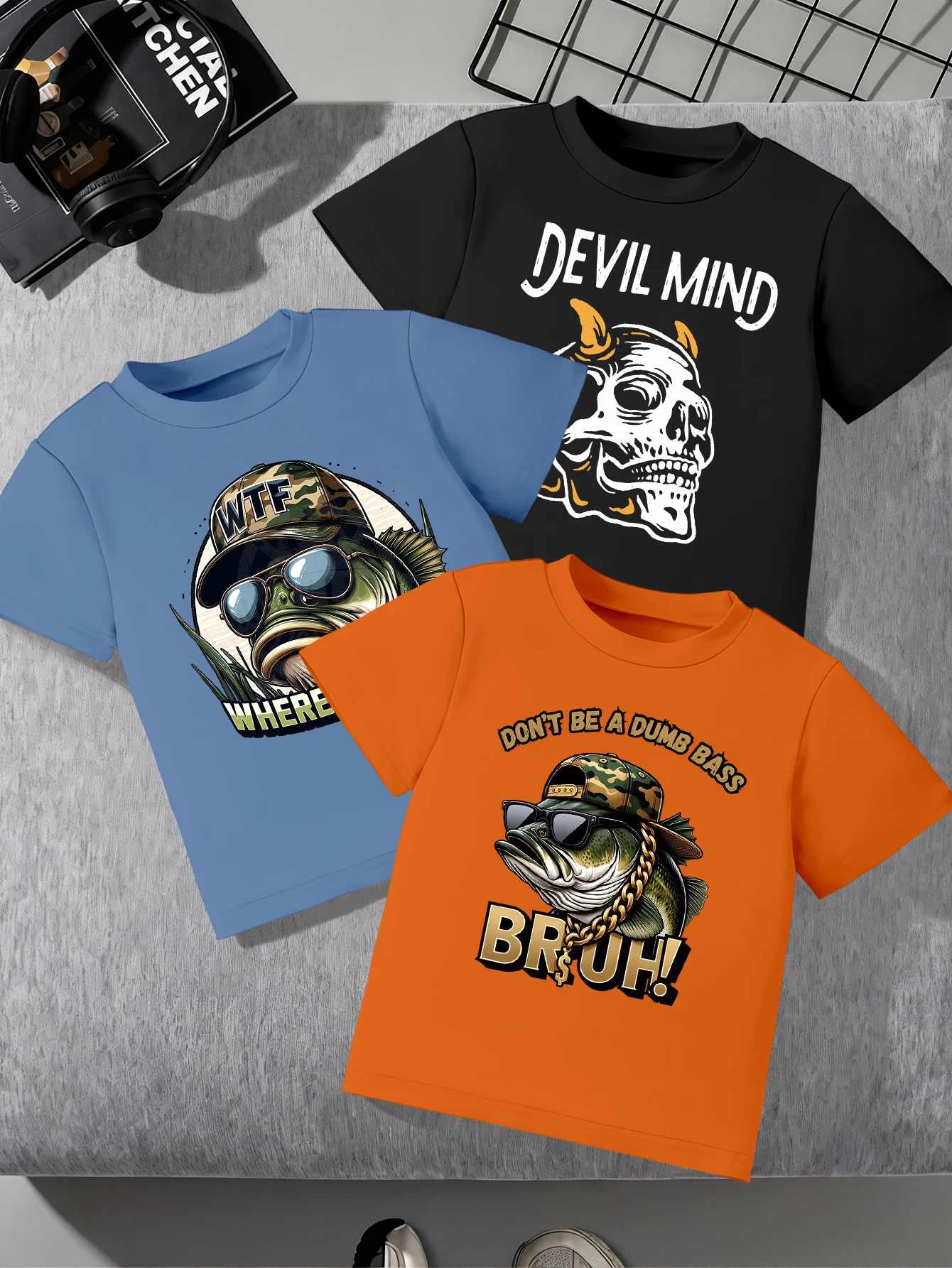3čepel kousky, americký retro hustý ryba, lebka střih tisk, léto boys' ležérní tričko