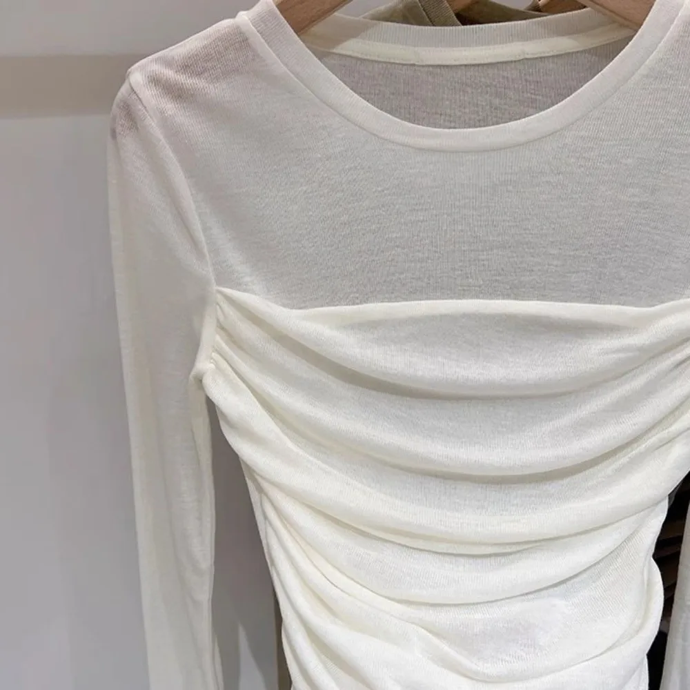 Dlouhé rukáv štíhlý dlouhé rukáv tričko průhledná pletivo vráska vzhled ženy hubený topy versatile pouliční oblečení korejské styl osvěta nejvyšší