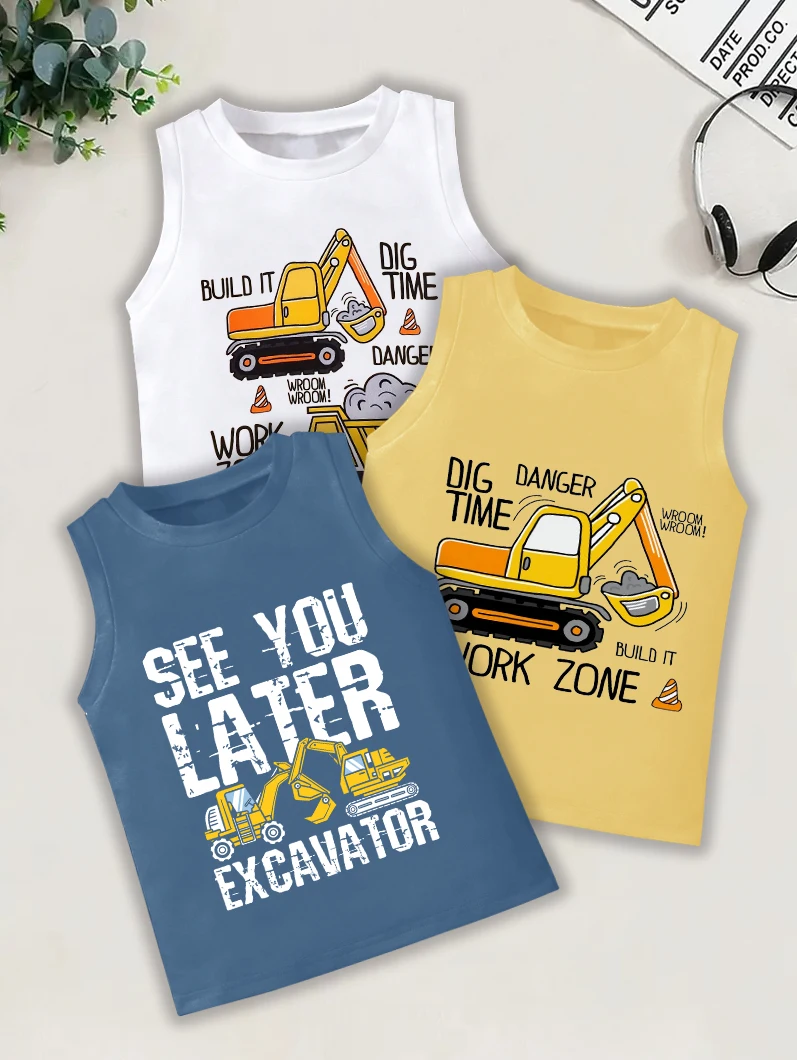 3čepel kousky, kreslený bagr střih tisk, děťátko chlapecké moderní ležérní kolo krk bez rukávů tričko tílko