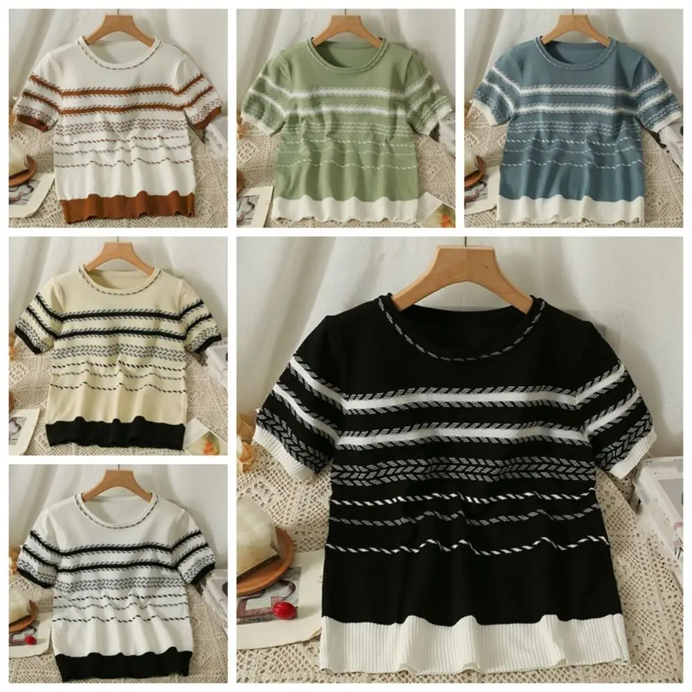 Móda iny krátký rukáv osvěta nejvyšší léto ženské oblečení proužek pletené tričko bottoming košile volné pletené zboží ženy ženské