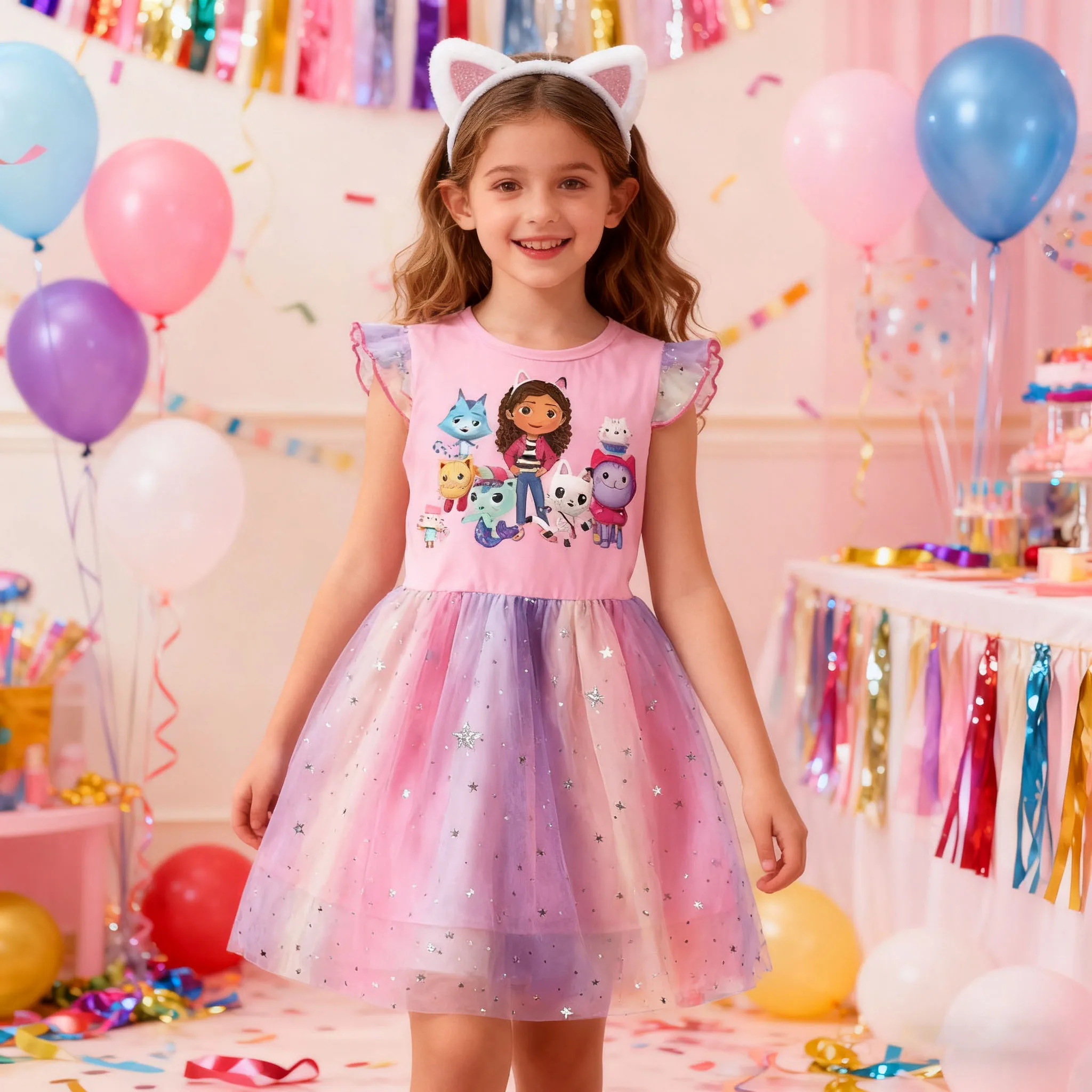 Dívčí kreslený gaby kocour dress+headband děti gabby's domeček pro panenky kněžna šaty děti létat rukáv tutu šaty pro vánoce narozeniny