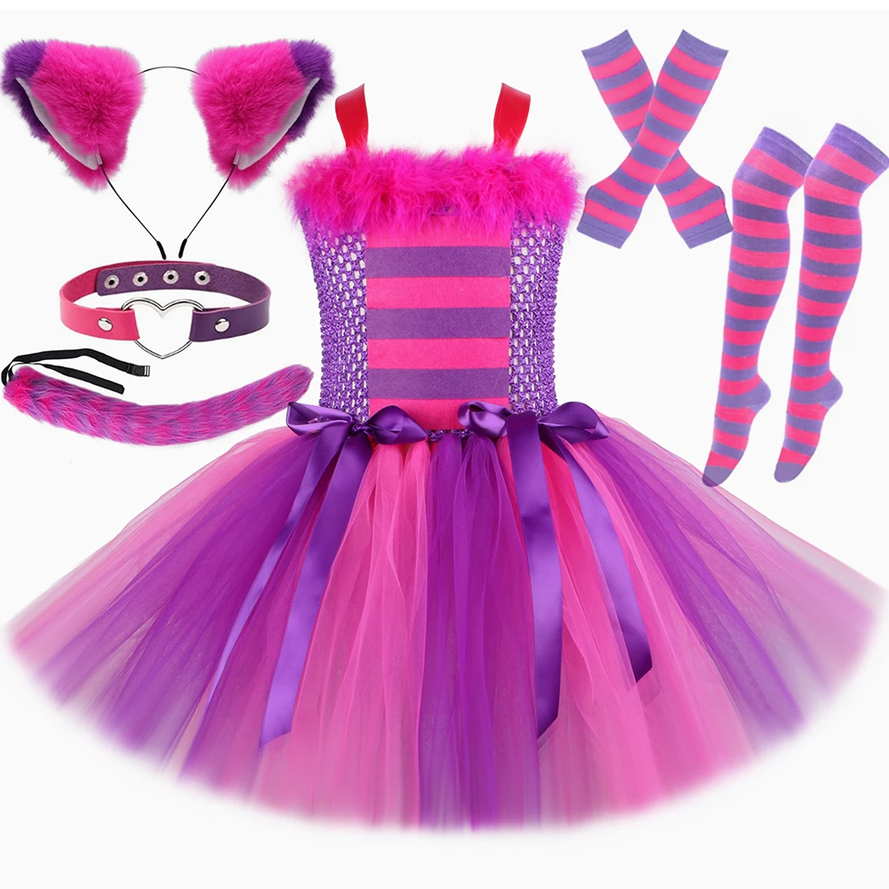 Dívčí cheshire kocour kostým děti wonderland kreslený magická pruhované kocour tutu šaty dívčí halloween karneval večírek šaty nahoře oblečení