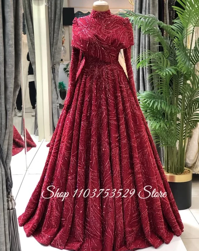 Přizpůsobené elegantní bordó muslimové soumrak talár přepychový korálkový high-neck long-sleeve islámské záruka talár angažmá talár