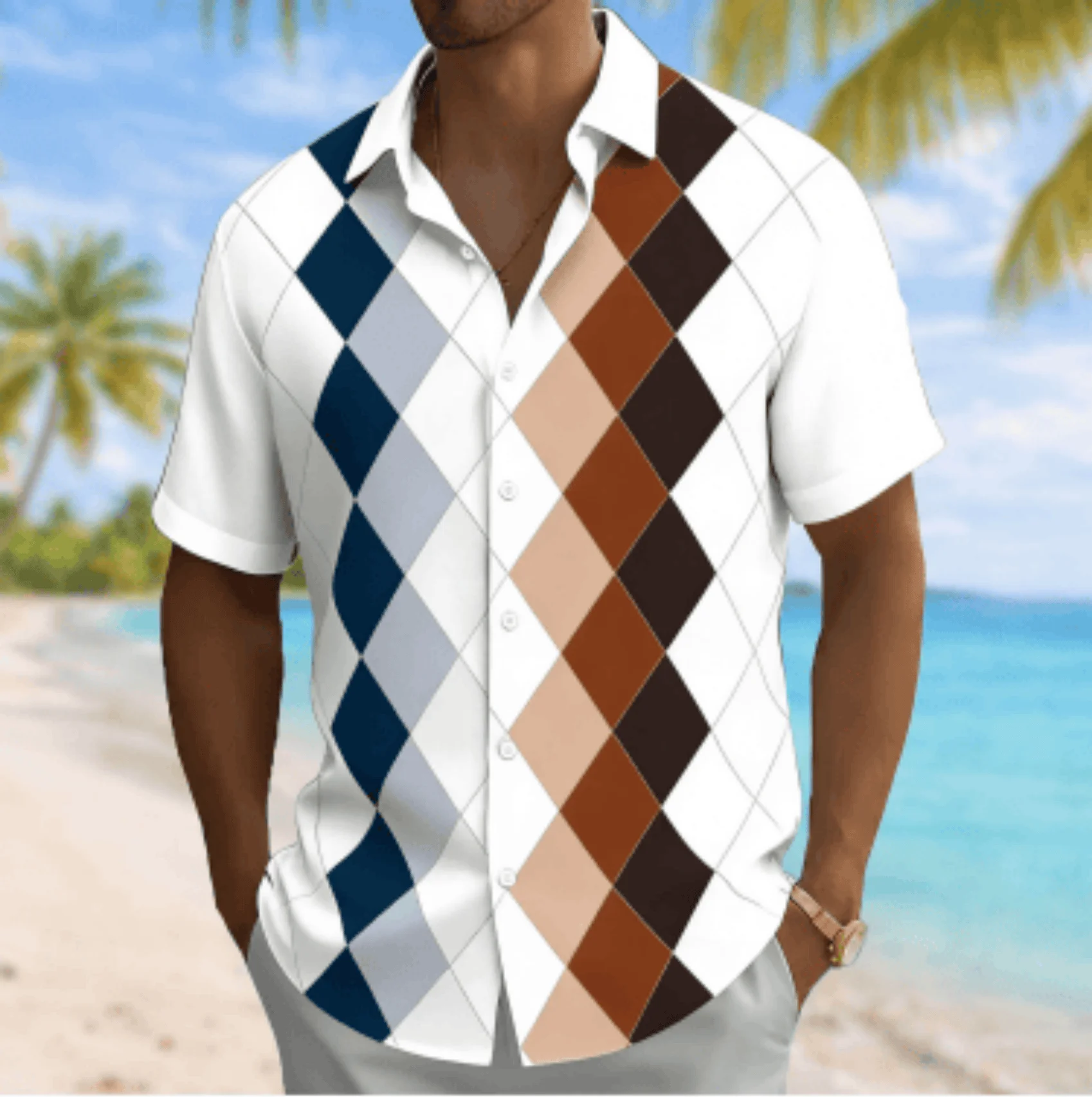 Pánské barva blok argyle tisk krátký rukáv košile, jaro léto ležérní zaměnit turn-down límec blůza, volné odpovídat nejvyšší