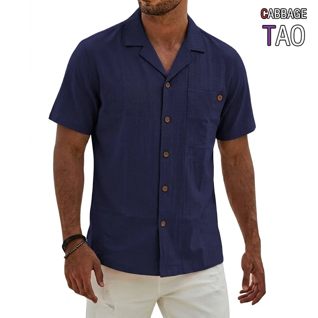 Léto vintage pánské v-neck košile stahovací design bavlna prádlo prodyšné stylové ležérní topy celistvý barva dovolená košile