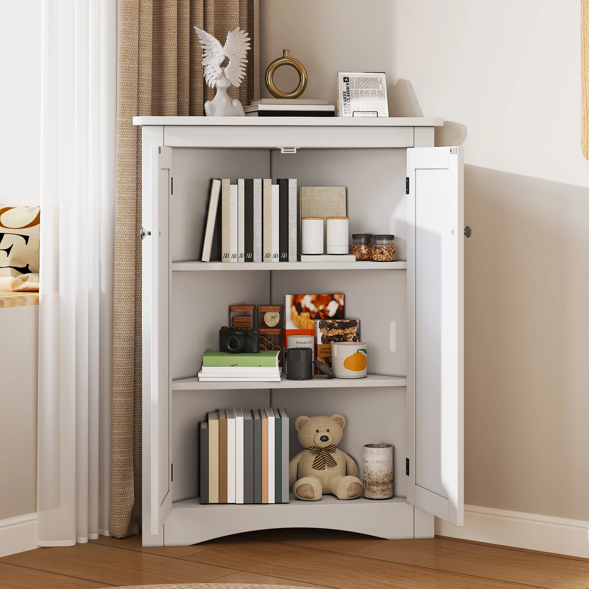 Bílá kout skříň pro koupelna – samostatný 2-door trojúhelníkové skříň s 3čepel police, vysoká kvalita MDF deska