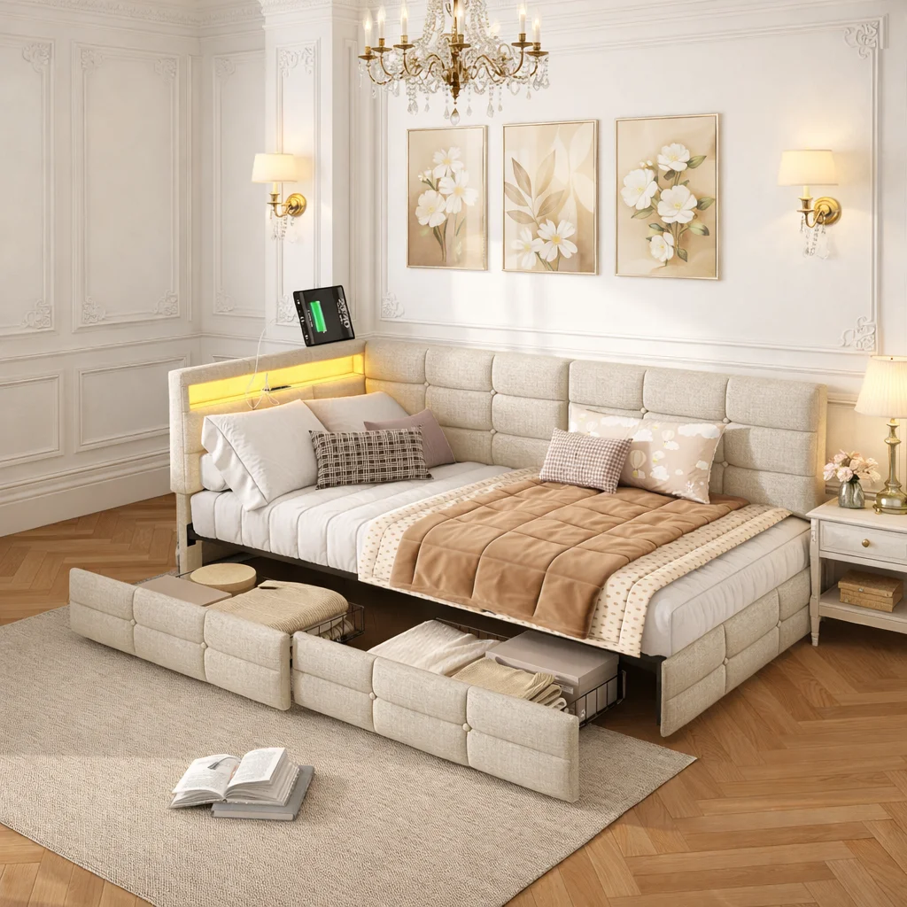 Čalouněné postel 90x200 cm s úložný zásuvek, daybed pohovka postel s LED a USB nabíjení, prádlo textilie platforma postel formulovat s slats, multifunkční úložný postel, mezera šetření cizozemský postel, děti postel, teen postel moderní desi