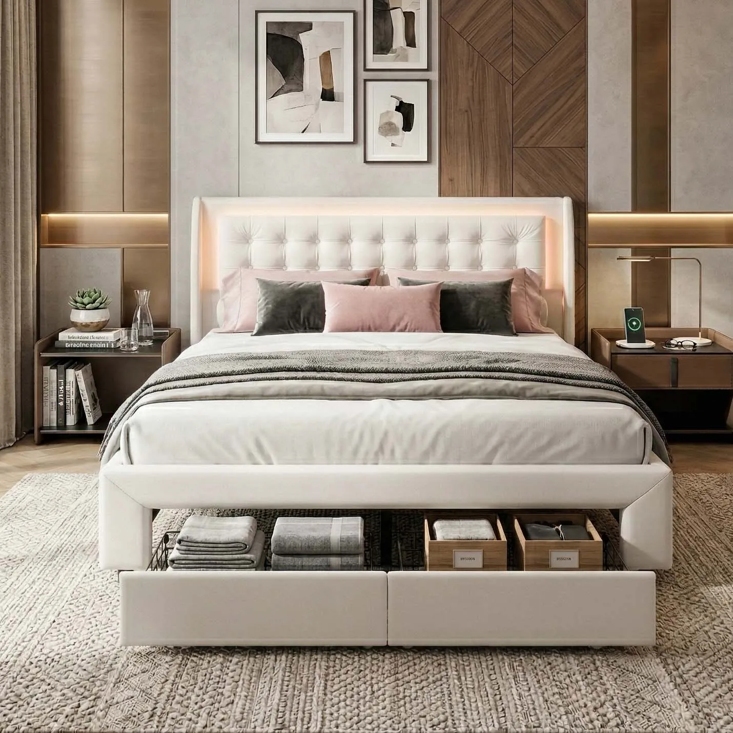 Comanlai 160 x 200 cm čalouněné postel, dvojitý postel s LED headboard, úložný postel s 4 zásuvek, mládež postel, PU, béžová
