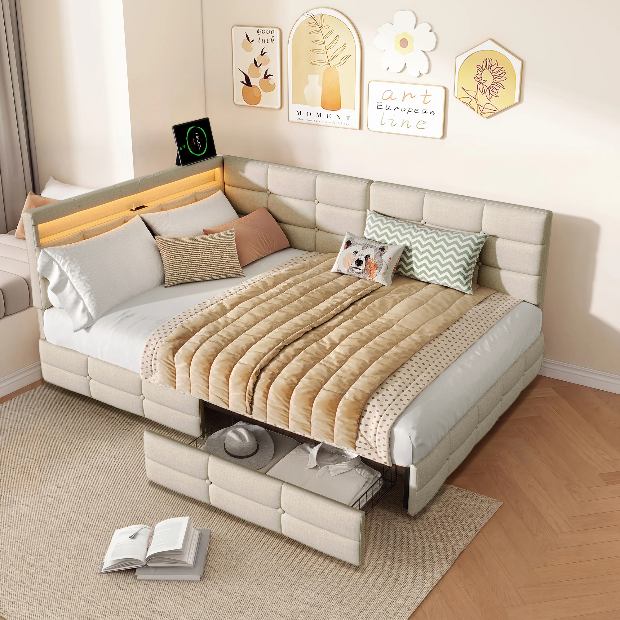 Comanlai l-shaped cizozemský postel, čalouněné pohovka postel, s LED světel , USB nabíjení nádraží a 2se zásuvek, single/double postel formulovat