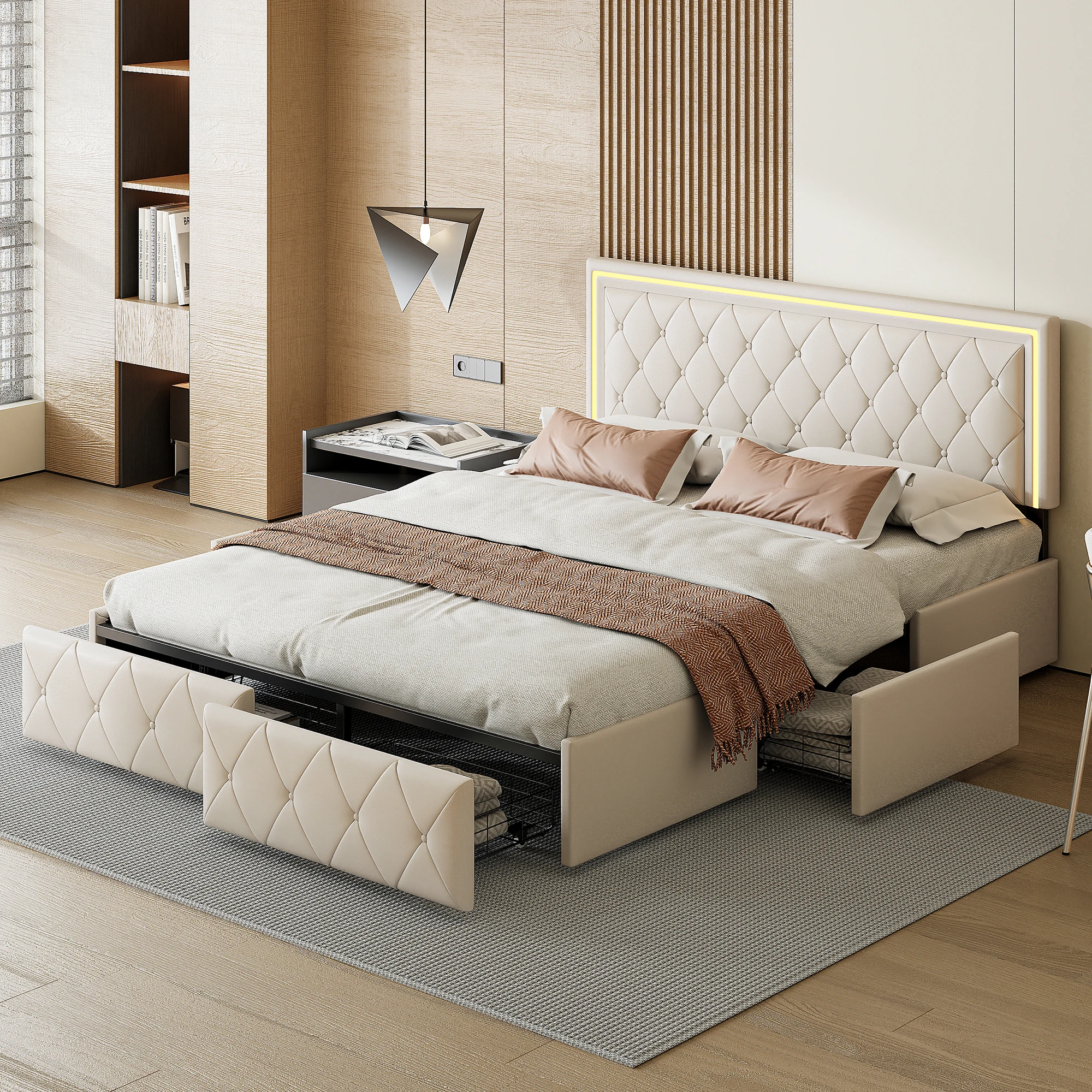 Dvojitý postel 160x200 cm, úložný lůžka s 4 zásuvek, height-adjustable headboard s LED, falešný kůže materiál, continental postel