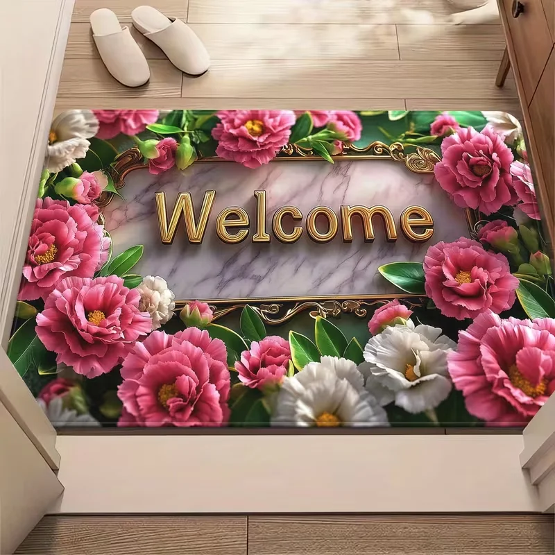 Květinová vítejte rohož - protiskluzový omyvatelné polyesterová rohož s růžová & bílá květin pro ložnice, žití pokoj, anebo vjezd dekorace