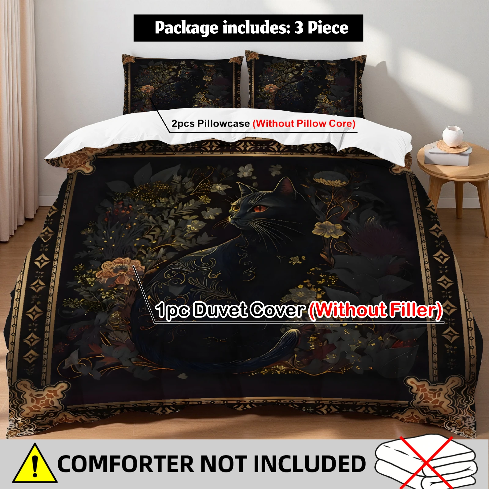 Mystic černá kocour květinová prošívaná deka zakrýt sada 2se pillowcases černá zlato gotický ložnice dekorace ložní prádlo sada zdvojený královna král rozměr