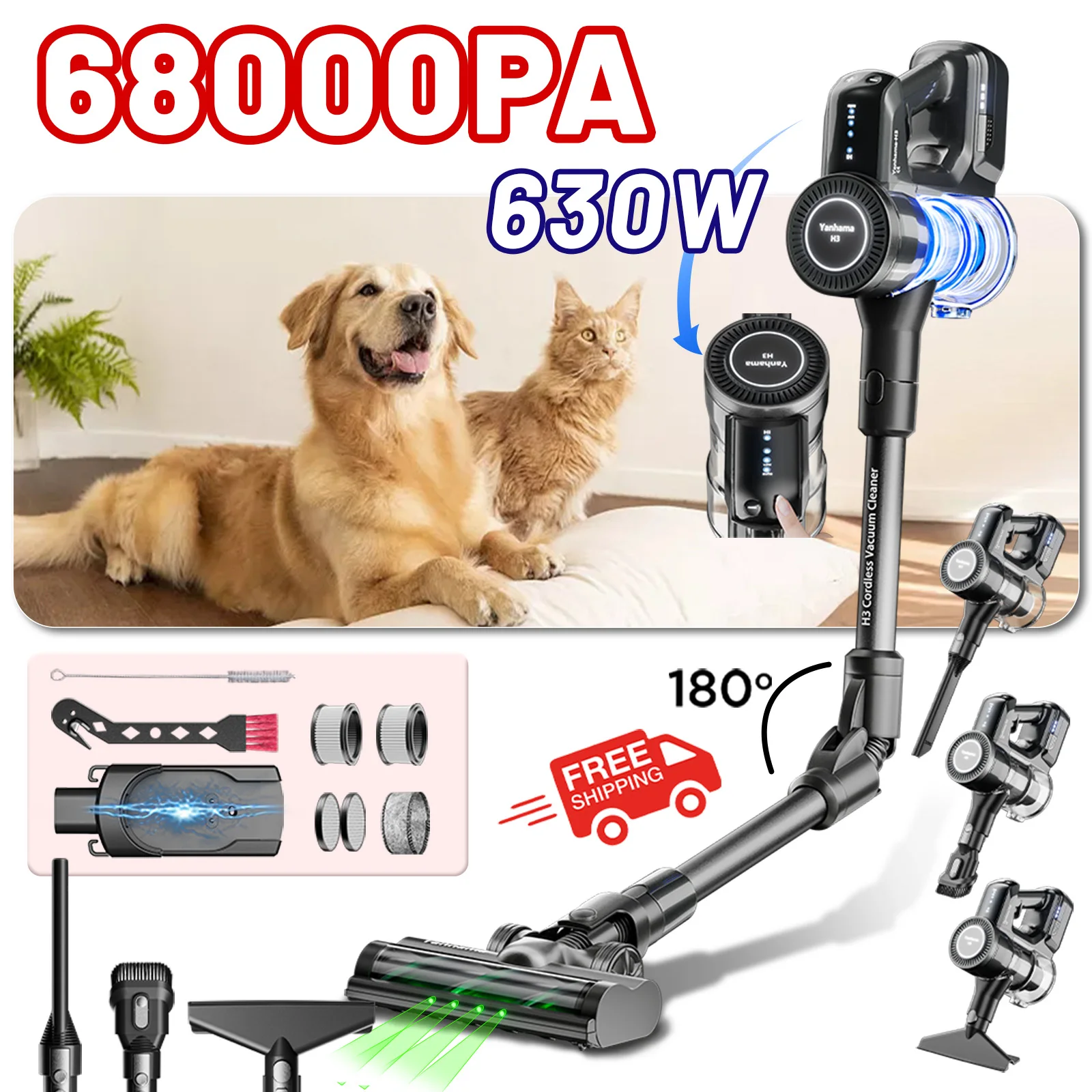 Yanhama 68000PA/630W akumulátorové vacuum s změť volný kartáč rolovat - silná sání, nepopsaný světlomety, removeable baterie