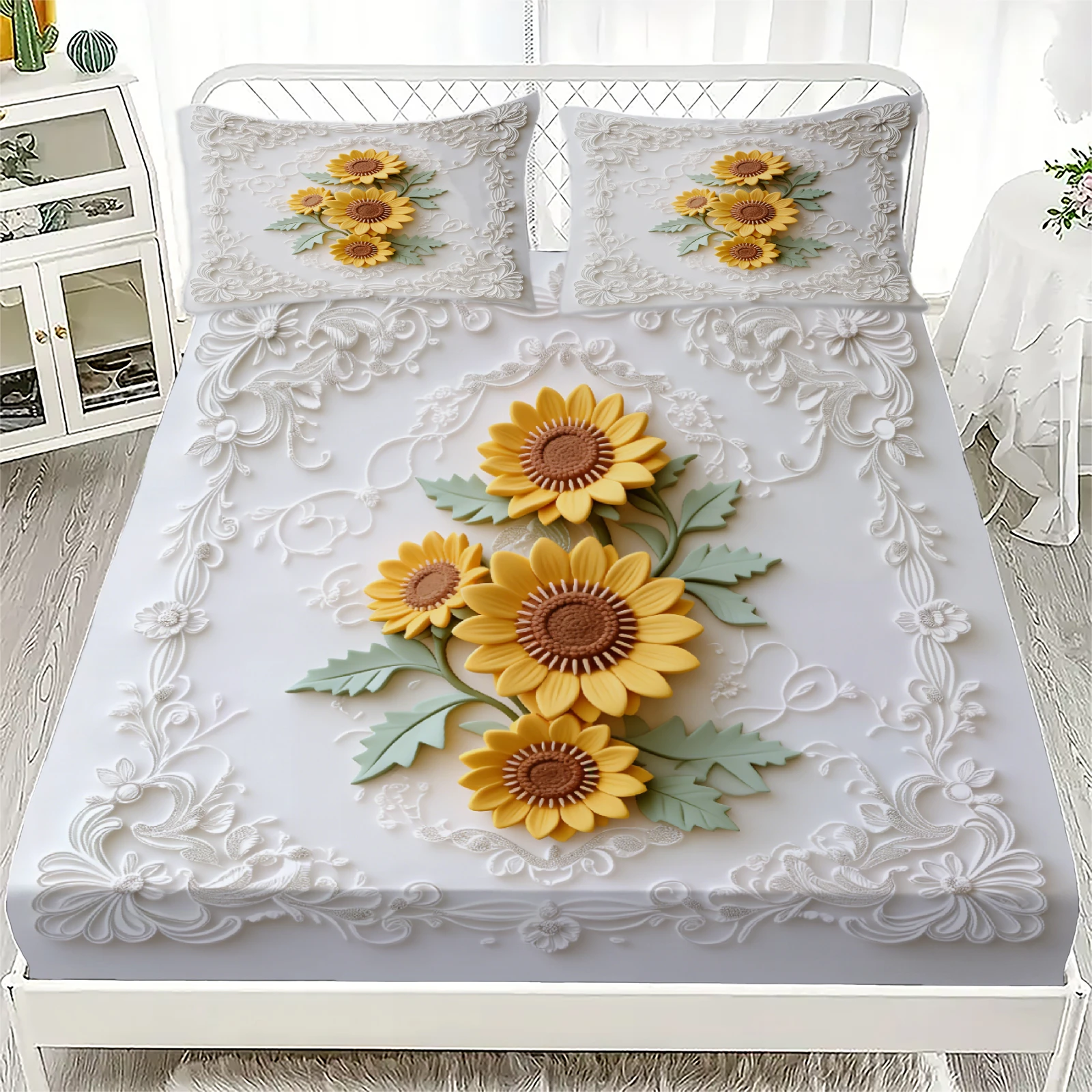 Slunečnice vyšívané napínací aršík sada bílá slunečnice květinová střih ložní prádlo s pillowcases pro ložnice