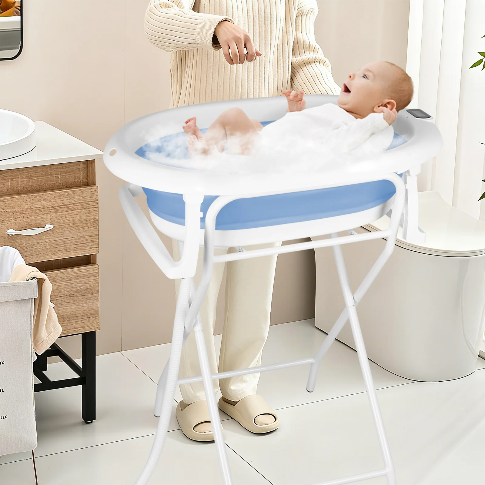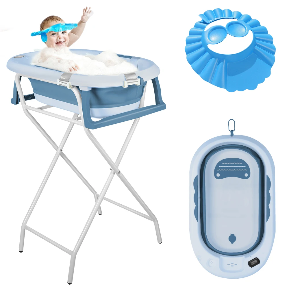 Děťátko skládací koupat s ocel stánek, vestavěný teploměr, ergonomická polštářek a dýmka, namyšlený a transportable, 0-3 let, grey/blue/pink