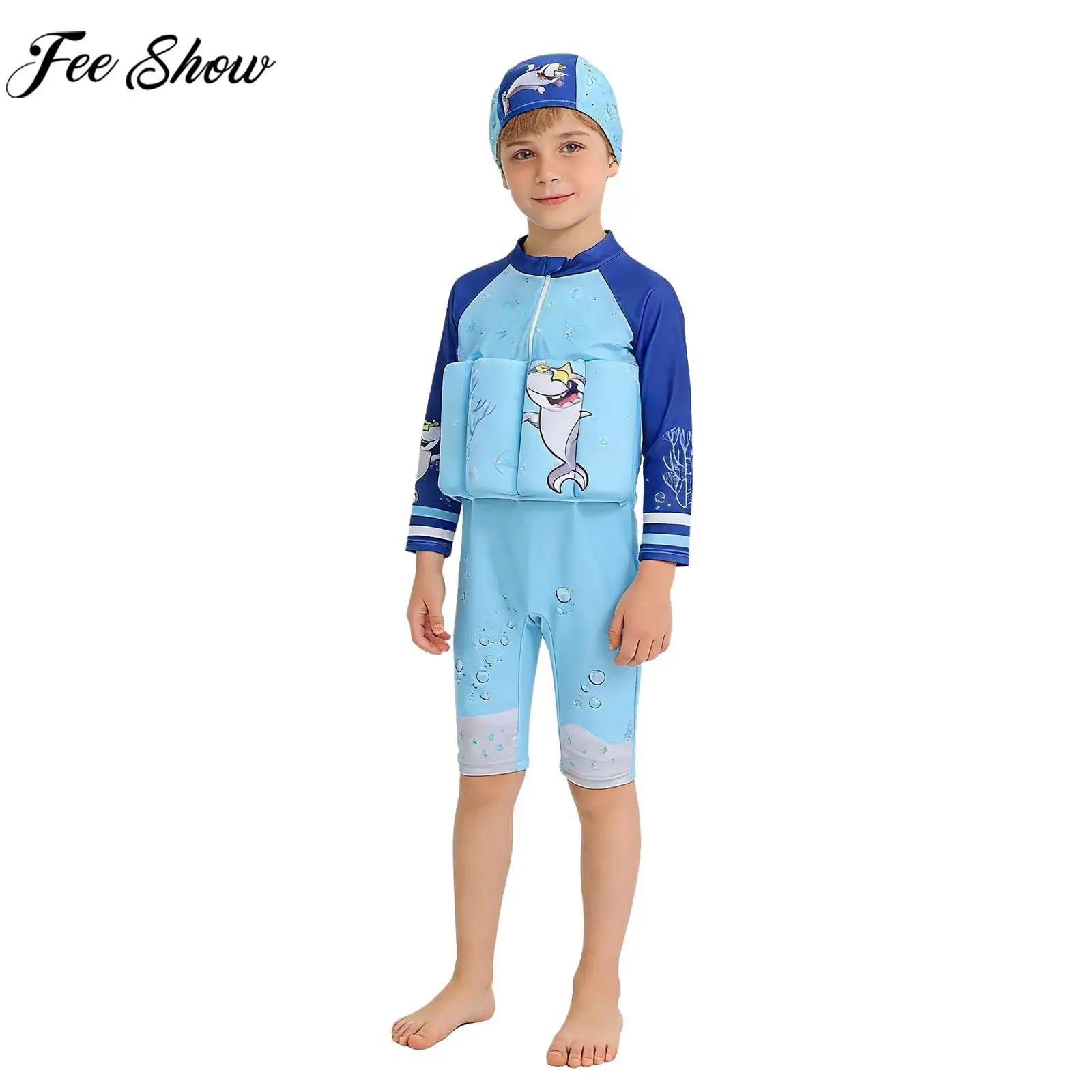 Děti floatie plavky dlouhé rukáv plovoucí plavek kombinéza s plavat čepice pláž kaluž floatation plavání učení koupací oblek