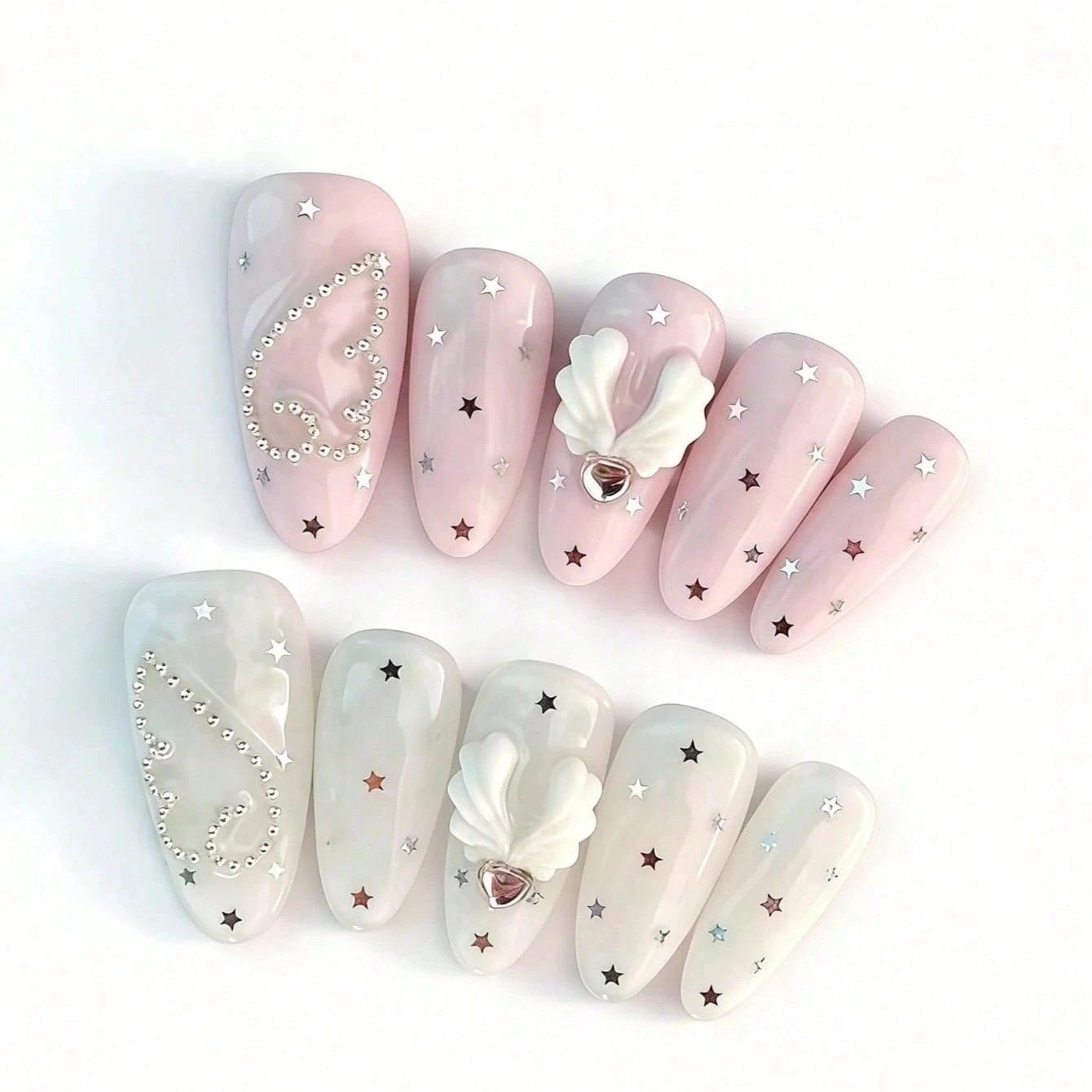 10uo kousky z hand-pressed almond-shaped hřebíky, chytrý falešná hřebíky, s růžová a bílá star-shaped křídla, vhodný pro ženy