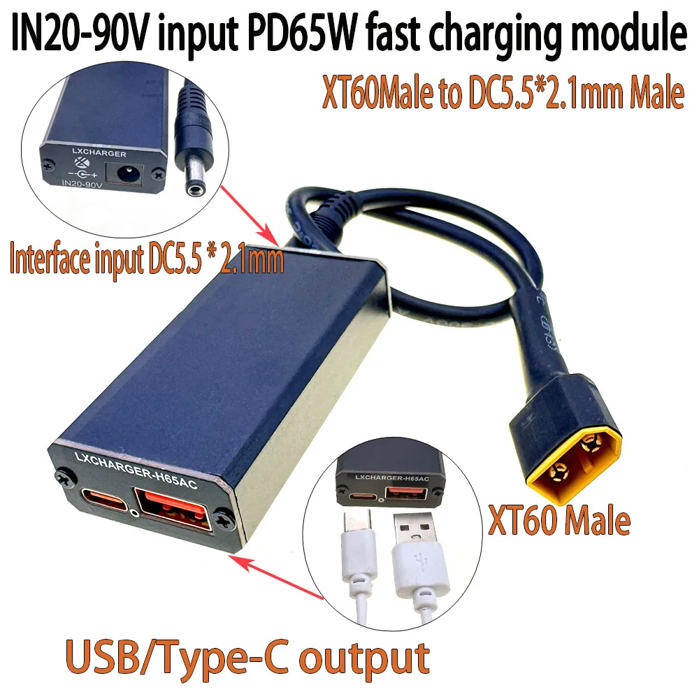 PD65W PD/QC3.0 QC2.0 dvojitý USB type-c mobilní telefon rychlý nabít adaptér DC20-90V krok shodit modul xt60 XT90 EC5 na 5V konektor