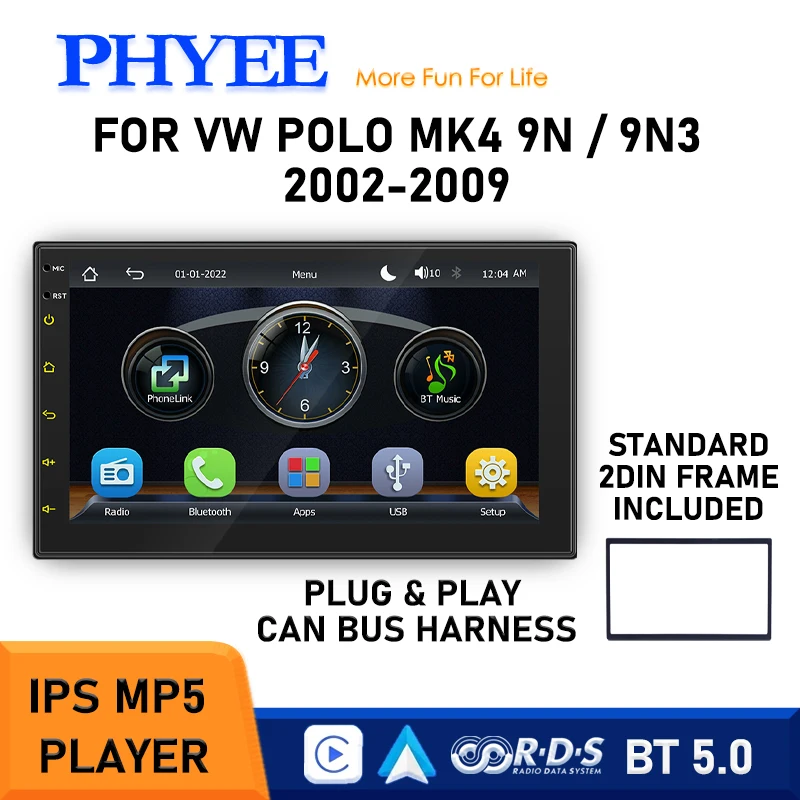 PHYEE 2se DIN 7" auto rádio pro VW polo mk4 2002-2009, s wirless jablko Carplay / Android auto, Bluetooth, rds AM FM, IPS displej