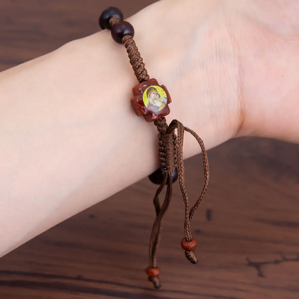 HTISOK východní ortodoxní dřevěný modlitba náramek nastavitelný rope-braided ruční korálkový šperků s ježíš a maria ikona