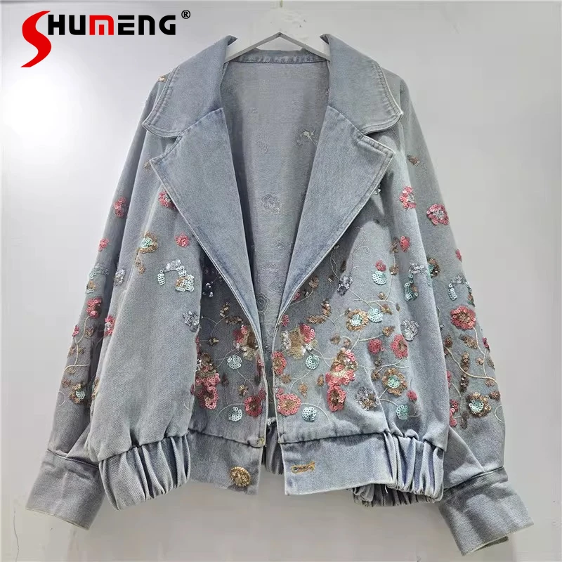 Móda vyšívané flitr džínové bundy dámská 2026 jaro nový stylové komfort bundy ženský dlouhé rukáv elegantní trend topy