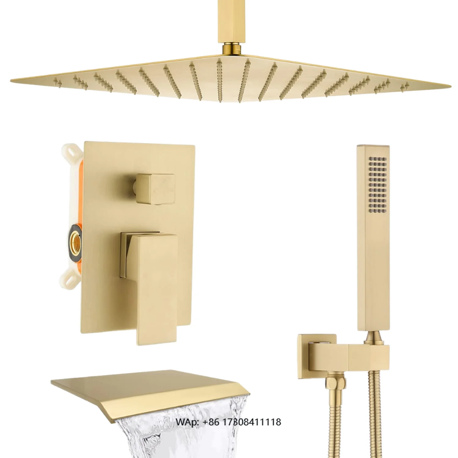 16-inch čtverec kartáčovaný zlato sprcha pípa sada déšť kapesní zeď montuje směšovače masáž pro apartmá hotel použít zakončit koupelna
