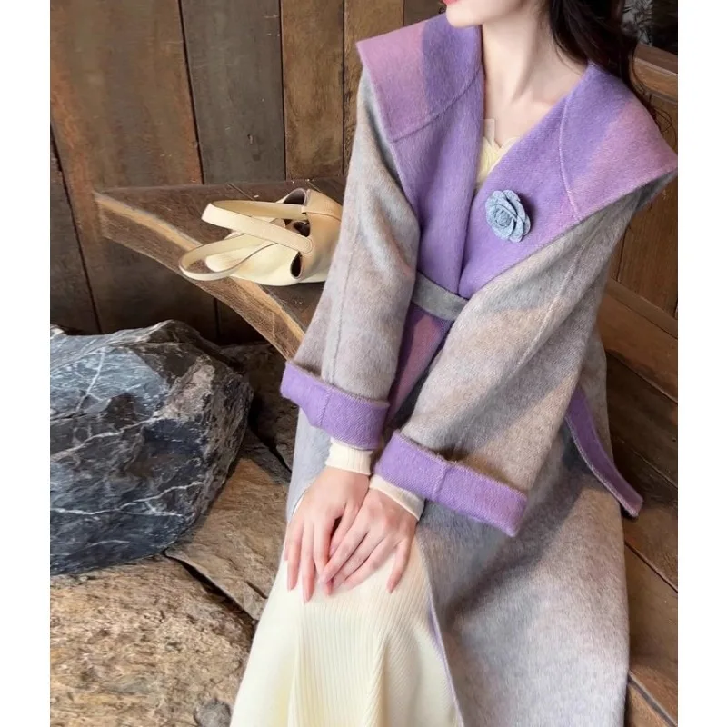 French-style mírný barva blokování řemen design šedá fialový mykaná příze kabát s high-end a elegantní cítit mykaná příze svrchní