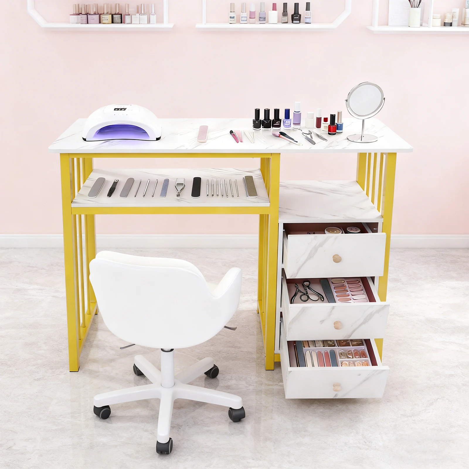 Luxuriöse Maniküre-Nageltische im japanischen Creme-Stil, Marmor-Tischaufbewahrung und Eisen-Kunstständer, Nageltische, Salonmöbel, FYMT