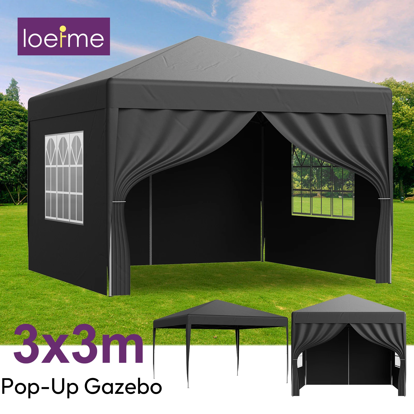 LOEFME 3 x 3 m Pop-Up-Pavillon, wasserdicht, winddicht, Sonnenschutz für den Außenbereich, mit 4 Seiten, abnehmbarer Stoff, tragbares Party- und Campingzelt
