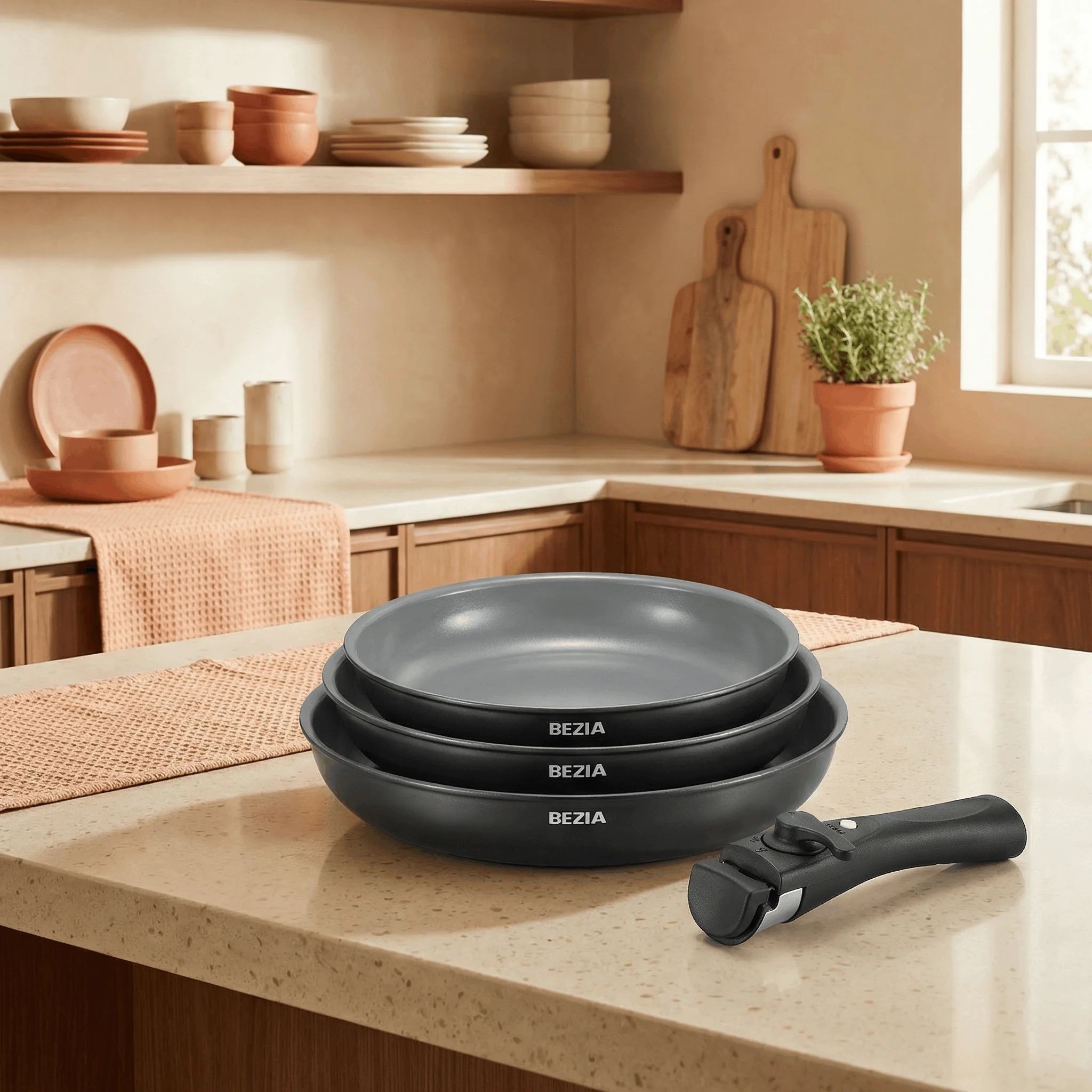 Pfannenset mit abnehmbarem Griff, Bratpfannenset mit Keramikbeschichtung, Induktionspfannenset für alle Kochfelder, 20 + 24 + 28 cm