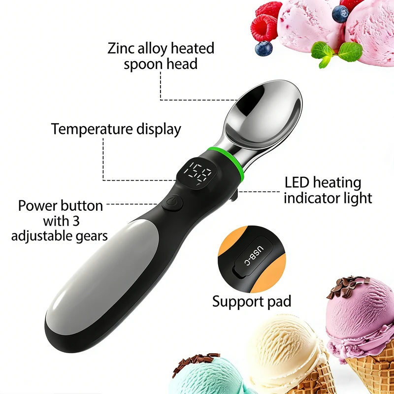 Elektrischer Eisportionierer mit beheizter Abtauung, digitaler Temperaturanzeige, Einhandbedienung, antihaftbeschichteter Schaufel für Eiscreme