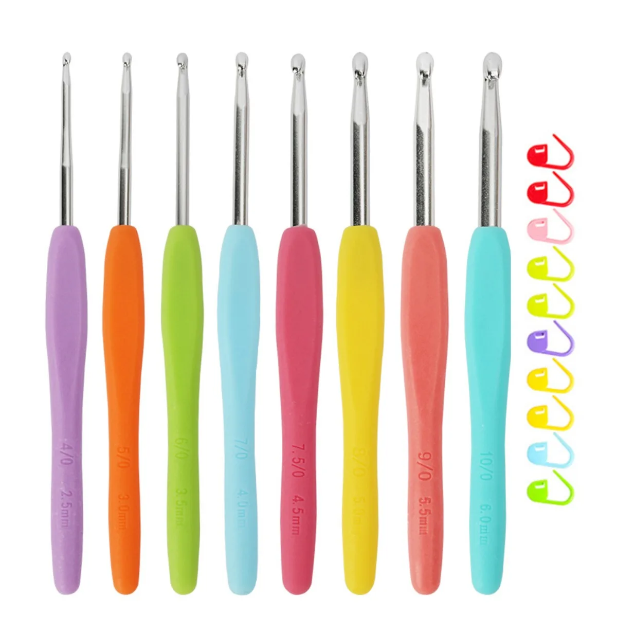 8 Stück/Set Häkelnadel 2,5–6,0 mm Aluminium-Häkelnadeln mit buntem, weichem Gummigriff, gepolsterte Griffe, Stricknadel