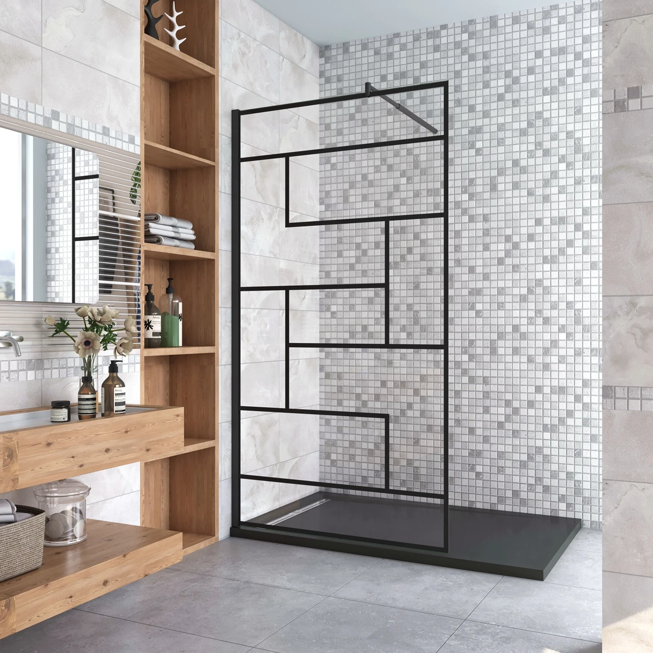 H.190 cm begehbare Duschwand 70/80/90/100/110/120 cm mit mobile Wand 30 cm Glas 8 mm gehärtetes Antikalpflege, 90 cm Stabilisatorstange