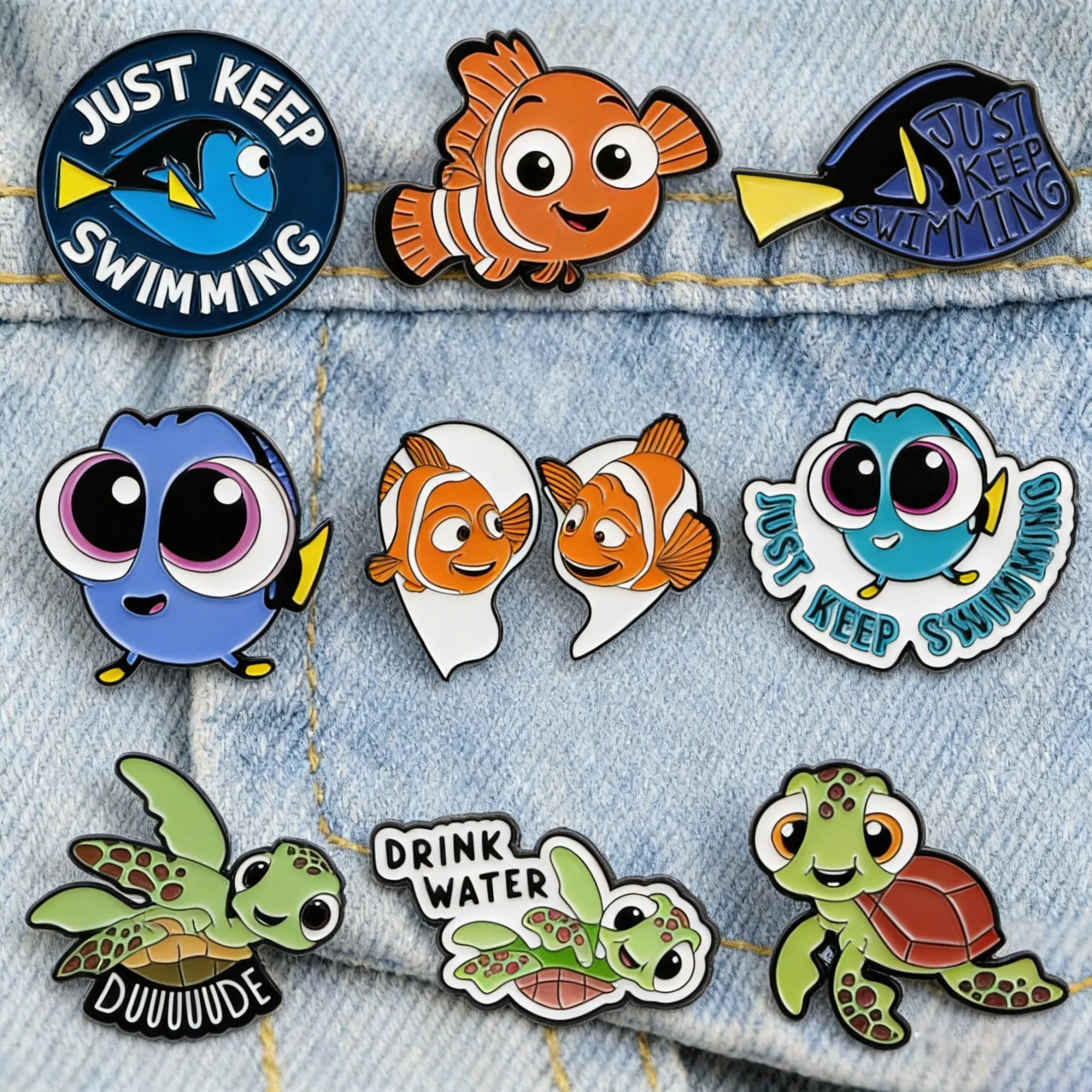 Niedliche Fisch-Emaille-Pins „Just Keep Swimming“ Cartoon-Broschen für Rucksäcke Lustige Schildkröten-Anstecknadeln für Kinder & Fans