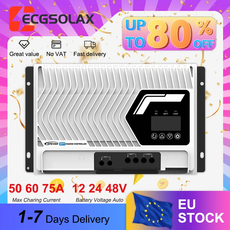 EPEVER 50/60/75A MPPT Solar-Laderegler IP32 Wasserdicht 12V/24V/48V DC Auto-Kompatibel mit LiFePO4 200V PV-Panel