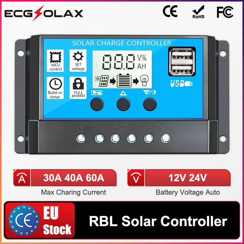 ECGSOLAX 30A 40A 60A PWM Solar-Laderegler 12V 24V Batterieregler Dual USB 5V/2A Solarpanel-Regler