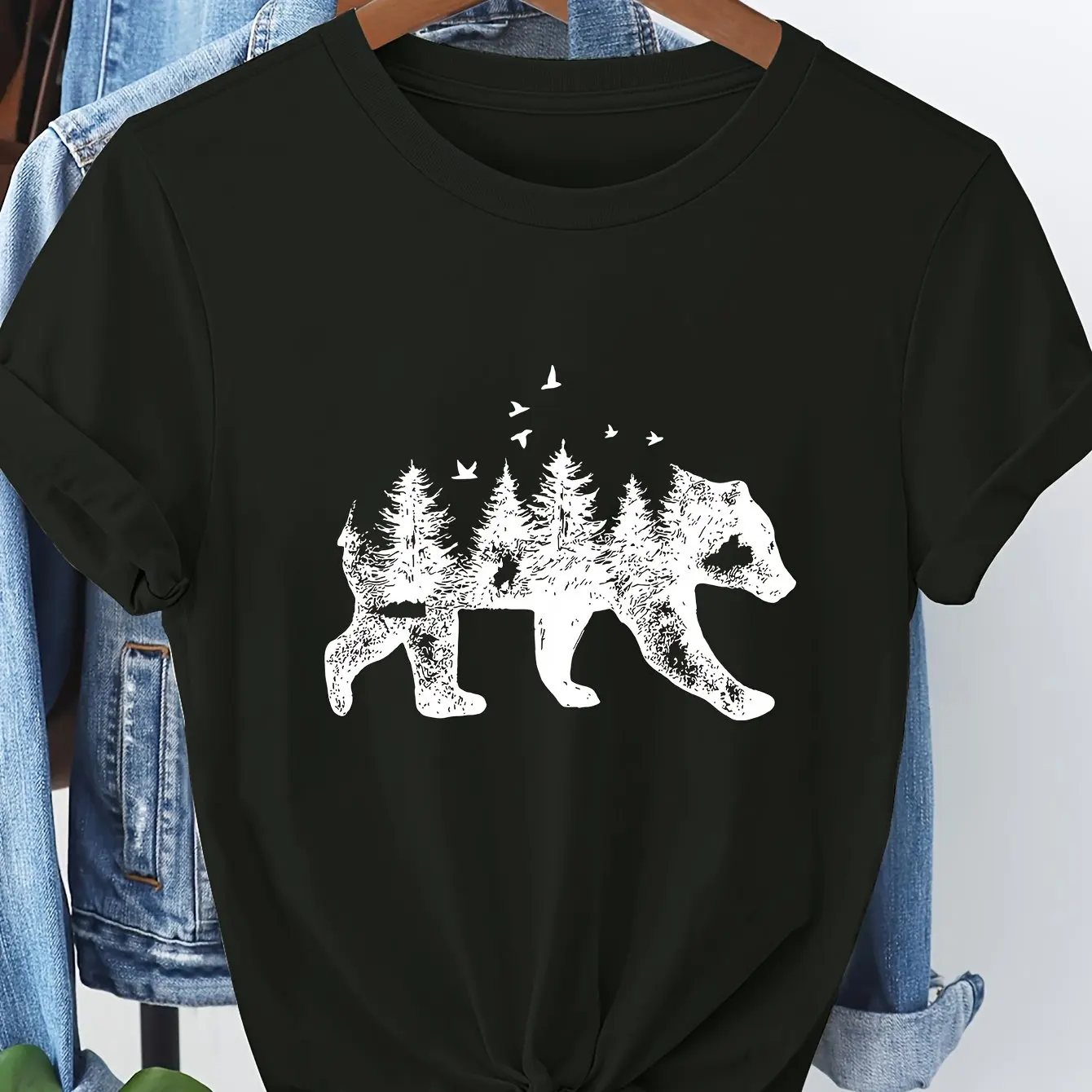 26 Frühlings-Sommer-Damen-T-Shirt mit schwarzem Bären-Grafik – komplettes T-Shirt mit Bären-Kiefern-Vögeln-Design für lässige, alltägliche formelle Outfits