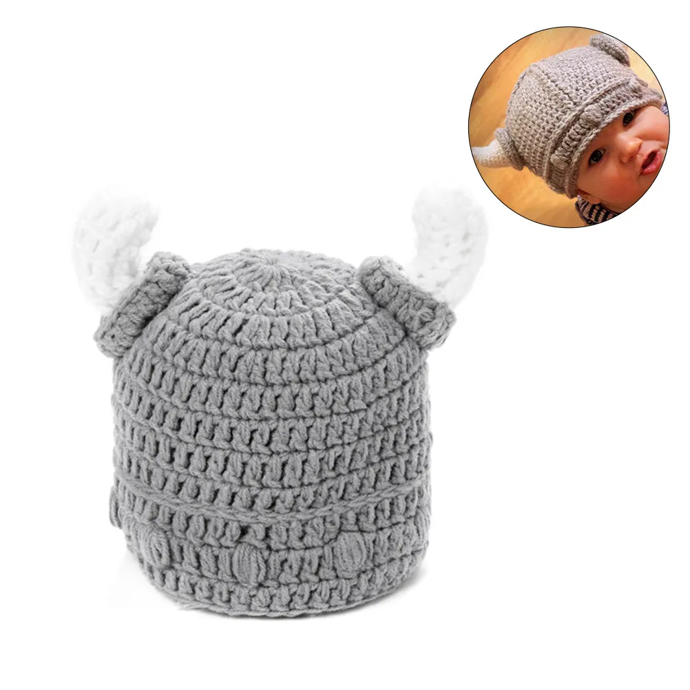 1 Stück Kinder-Strickmütze Grau mit Bullenhörnern Wintermütze für Kinder Warm Dehnbar Tragbar für Drinnen und Draußen Häkelmütze im Wikinger-Stil